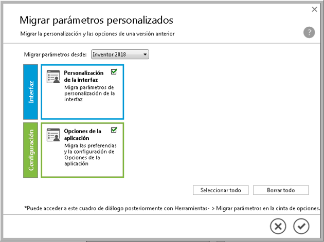 Utilice Migrar parámetros personalizados para incorporar los parámetros de Opciones de la aplicación y de personalización existentes a la última versión de Inventor. Los administradores tienen un mayor control sobre el uso de esta opción en las implantaciones.