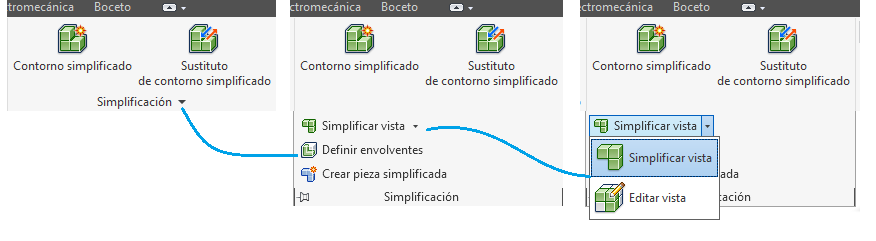 En los documentos de ensamblaje, la ficha Simplificar se ha quitado y los comandos se han trasladado al panel Simplificación. El panel Simplificación era anteriormente el panel Simplificar.