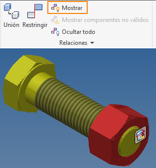 Aparece un icono de bloqueo en la ventana gráfica al insertar una restricción de inserción con la opción Bloquear rotación seleccionada. Por defecto, el icono de bloqueo ya no se muestra tras cerrar el cuadro de diálogo Añadir restricción. Para ver el icono de bloqueo en la ventana gráfica tras cerrar el cuadro de diálogo, haga clic en el comando Ensamblar panel Relaciones Mostrar. Cuando se muestre, puede hacer clic con el botón derecho en el icono y acceder a diversas opciones para realizar supresiones y otras operaciones de edición.