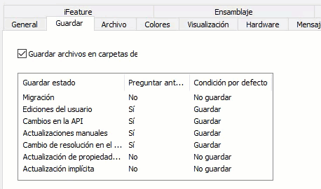 Si cierra un archivo sin guardar los cambios realizados, por defecto, un mensaje le preguntará si desea guardar los cambios antes de cerrar. Haga clic en las entradas de las columnas Preguntar antes de guardar y Condición por defecto para especificar el comportamiento de guardado para cada tipo de estado de guardado. Utilice la casilla de verificación Guardar archivos en carpetas de biblioteca para controlar la condición por defecto del guardado de archivos en las carpetas de bibliotecas del Centro de contenido. Cuando está sin seleccionar, los archivos de las rutas de biblioteca no se muestran en el cuadro de diálogo Guardar y no se guardan.