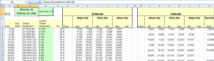 El área que contiene los datos de rosca comienza en la cuarta fila. Las columnas de los datos de rosca se dividen en tres secciones: