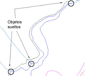 Un objeto suelto aparece normalmente a causa de una digitalización imprecisa, en aquellos puntos en que un objeto se extiende más allá de la intersección prevista con un objeto destino. Utilice Partir objetos cortados antes de utilizar Borrar objetos sueltos.