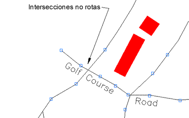 Nota: AutoCAD Map 3D toolset no utiliza valores de tolerancia al partir objetos cortados. La acción Partir objetos cortados corrige posibles problemas en todas las capas y puede partir líneas que estaban destinadas a objetos diferentes, como ríos y carreteras. Para evitar este problema, utilice Partir objetos cortados en una capa cada vez. La utilización de la acción Partir objetos cruzados en un arco cuyos puntos finales están muy próximos puede provocar la duplicación o extensión del arco.