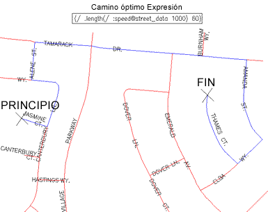 Para analizar el trazado de ruta en una red de carreteras basándose en el tiempo, en lugar de la distancia, asigne una velocidad o un límite de velocidad a cada vínculo utilizando un campo de datos de objeto o un campo de una base de datos externa vinculada. A continuación, puede definir la propiedad Resistencia directa de vínculo como una expresión que utiliza estos datos de límite de velocidad. Por ejemplo: