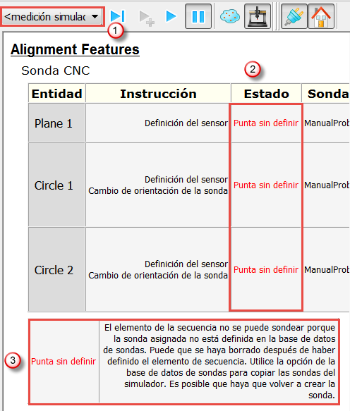 Después de completar la secuencia de inspección, revise la pestaña de Info de cada elemento y solvente los errores de sonda antes de ejecutar la secuencia en el dispositivo de medición. En primer lugar, compruebe si hay errores en la <medición simulada> y, después, compruebe si hay errores en la pieza maestra.