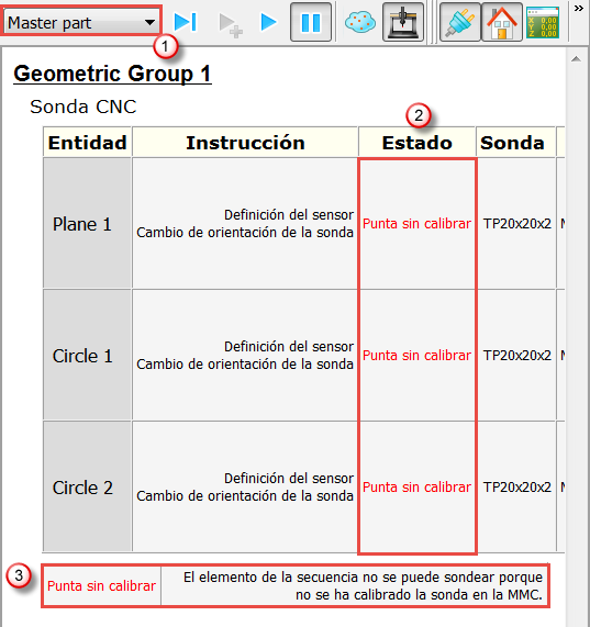 describe el error. El error de Punta sin calibrar indica que se puede utilizar la sonda, pero hay que calibrarla antes con la pestaña de Máquina.