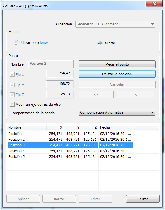 . Se muestra el cuadro de diálogo Calibración y Posiciones.