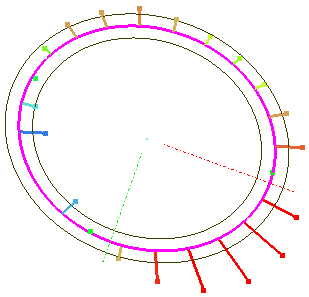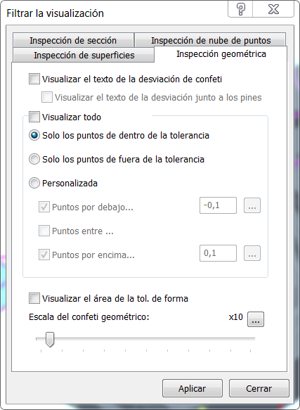 Para filtrar la visualización en la Vista CAD de los puntos medidos en las figuras geométricas, haga clic en la pestaña de Vista > panel de Opciones de la vista > Filtrar la visualización y seleccione la pestaña de Inspección geométrica.