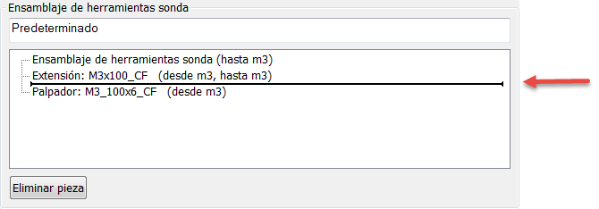 - Para eliminar una pieza del ensamblaje de herramienta sonda, seleccione su entrada en la lista de Ensamblaje de herramientas sonda y haga clic en el botón de Eliminar pieza.