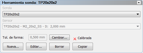 Nota: La Tolerancia de forma y el botón de Cambiar únicamente están visibles cuando el documento está conectado al dispositivo de medición y la opción de Usar la configuración de la tolerancia de forma está seleccionada en el cuadro de diálogo de Configuración de la calibración.