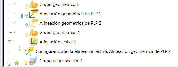En este ejemplo, la alineación activa se configura inicialmente como Alineación Geométrica PLP 2 (indicado por el icono de la alineación en dorado). Cuando se ejecuta el elemento de Alineación activa 1, se restablece la alineación activa a la Alineación geométrica de PLP 1: