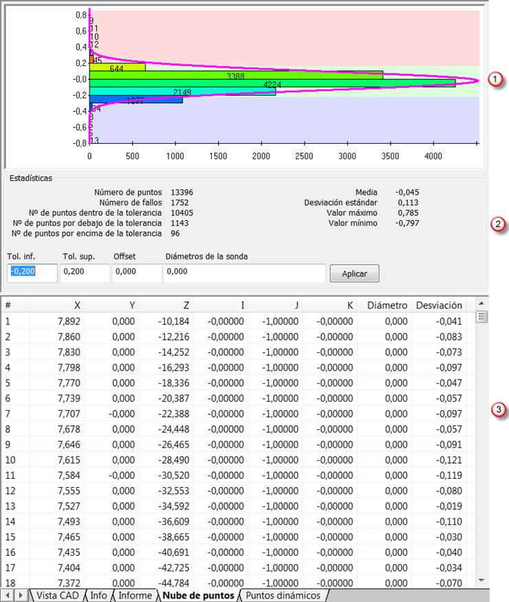 Tabla — Recoge el identificador (#), la posición (X, Y, Z), el vector normal (I, J, K), el Diámetro de la sonda y la Desviación de cada punto respecto de la superficie CAD.