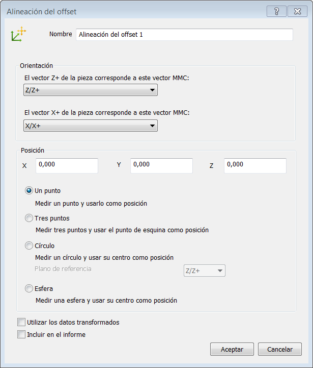 - Si en la secuencia de inspección las mediciones de las figuras construidas se han realizado con varios dispositivos de medición o desde varias posiciones del mismo dispositivo, active la casilla de Usar los datos transformados. Esto convertirá las coordenadas de dispositivo en coordenadas CAD, de modo que todos los cálculos utilicen un sistema de referencia común.