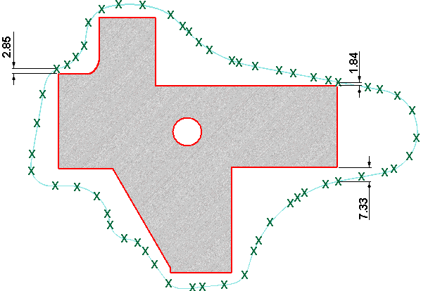 Utilice este tipo de ajuste para comprobar si una pieza inacabada puede acabarse según el modelo. Si todos los puntos en el ajuste óptimo tienen desviaciones positivas, existe un exceso de material alrededor del modelo y la pieza puede mecanizarse satisfactoriamente. Si hay puntos con desviaciones negativas, no hay material suficiente para acabarla pieza.
