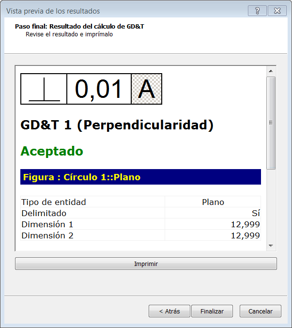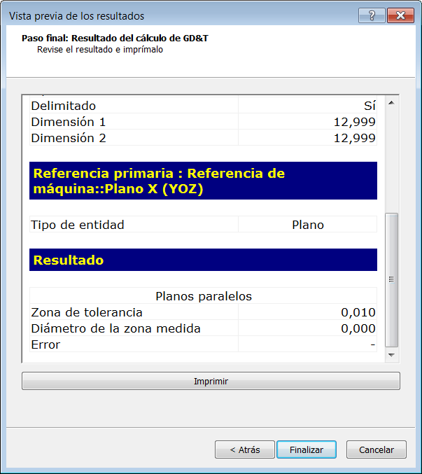 Desplácese hacia abajo para acceder a información sobre el elemento de referencia utilizado, la zona de tolerancia y el valor de error. Por ejemplo: