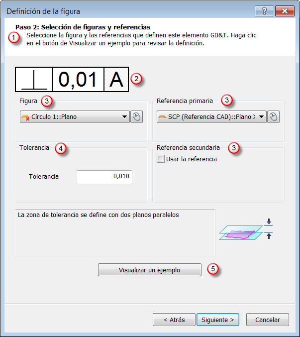 Las áreas de Figura y Referencia permiten seleccionar la figura a verificar y los elementos de referencia respecto de los que se verifica. Haga clic en el botón de