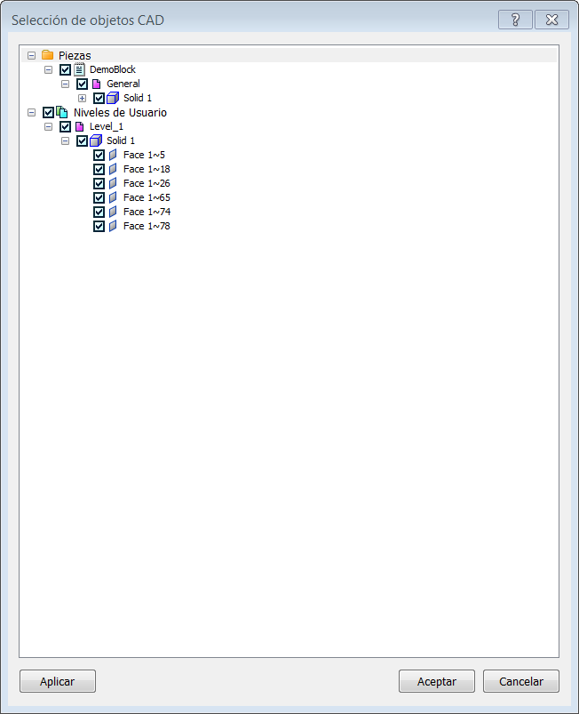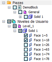 En este ejemplo, únicamente se pueden inspeccionar las caras Face 1~5 y Face 1~18 del nivel Level_1: