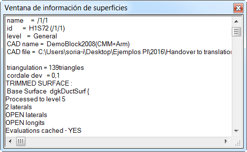 - Haga clic con el botón derecho en la vista CAD y seleccione la opción de Visualizar información de las superficies en el menú contextual. Se muestra la Ventana Información de Superficie.