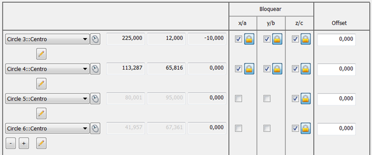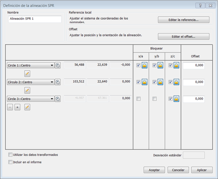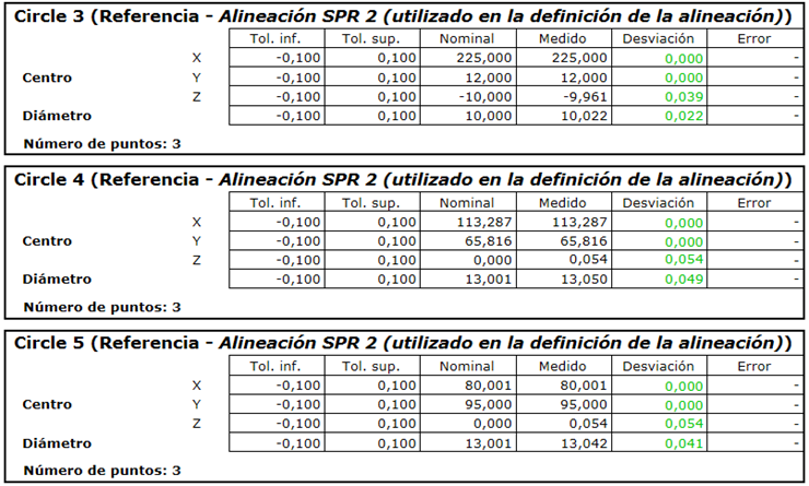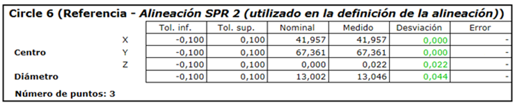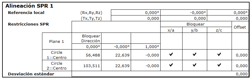 se asume que los ejes bloqueados están perfectamente posicionados, de forma que la pestaña de Informe muestra una desviación cero para cada elemento: