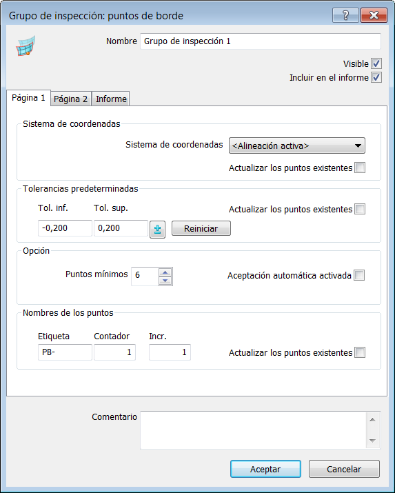 Opción — Introduzca los Puntos mínimos necesarios para medir la figura. Se considera que el grupo está sin medir hasta que se sondea el número de puntos configurado. Seleccione la opción de Aceptación automática activada para guardar los puntos tan pronto como haya sondeado el número de puntos correspondiente. Este atributo no tiene ningún efecto cuando asigna una trayectoria de sonda al grupo.