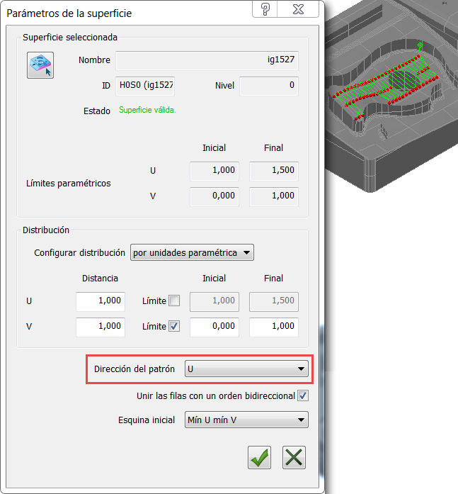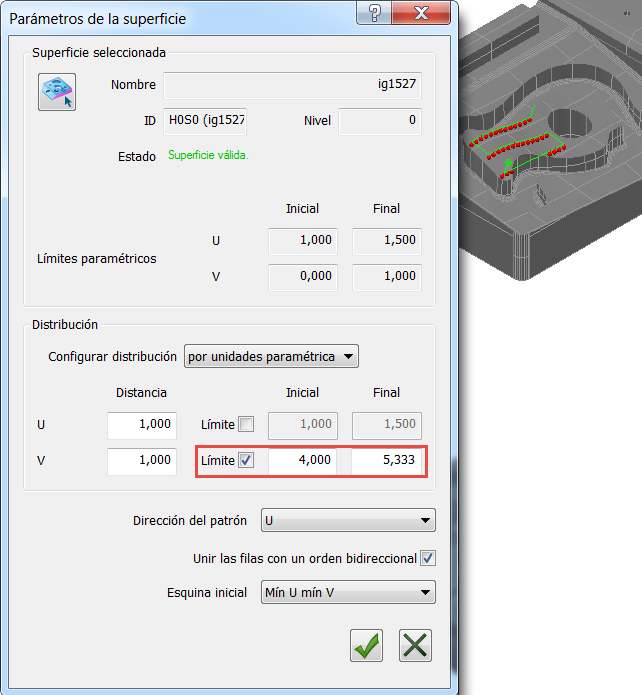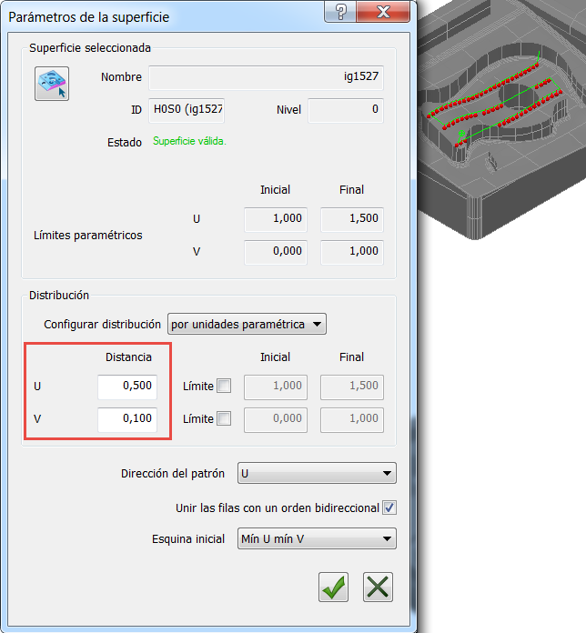 En este ejemplo, el recuadro U especifica la distancia de paso entre las filas, y el recuadro V especifica la distancia de espaciado entre los puntos. Ambos valores se expresan en las unidades paramétricas especificadas para la superficie.