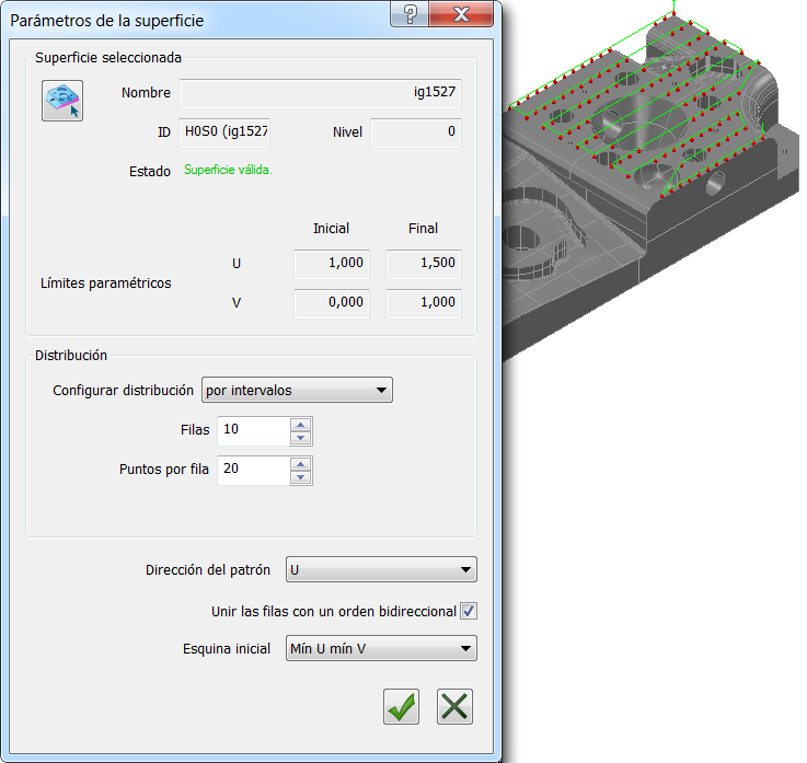 La opción de por intervalos del cuadro de diálogo de Parámetros de la superficie se diferencia del método Raster en que permite restringir la trayectoria a la superficie seleccionada. Para crear trayectorias de la sonda con intervalos, introduzca el número de Filas y de Puntos por fila de la trayectoria de la sonda. PowerInspect crea una trayectoria en la que las filas y los puntos de la sonda se distribuyen uniformemente por la superficie en las direcciones u y v. Por ejemplo: