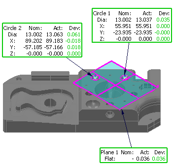 Utilice la pestaña de Herramientas > panel de Transformar > Transformar nominales para transformar todos los nominales desde una orientación y posición a otra. Por ejemplo, puede utilizar esta opción para transformar mediciones respecto de un sistema de coordenadas común.