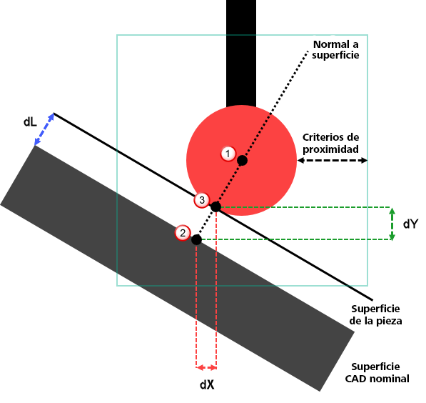 El punto de contacto en la superficie de la pieza. Se localiza proyectando el radio del palpador a lo largo de la normal de la superficie. PowerInspect utiliza este punto para calcular las desviaciones de (dL, dX y dY) que hay entre la superficie del modelo y la de la pieza.
