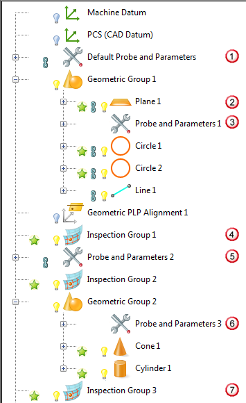 Los cambios de los atributos se envían al dispositivo de medición como parte de la trayectoria de la sonda creada para el Grupo de inspección 1 sin la intervención del elemento de alineación. Esto es porque las configuraciones de la sonda y del sondeado solo se actualizan con elementos que crean una trayectoria de sonda.