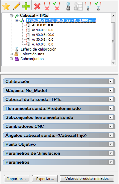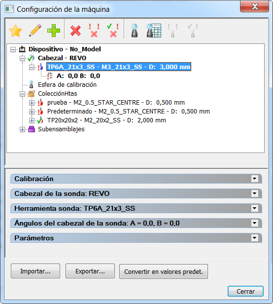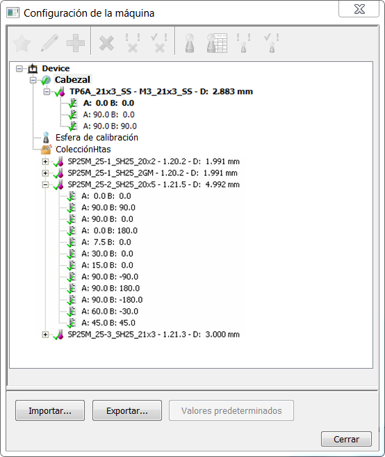 Para ver y administrar la sonda base de datos de la sonda y mostrar los detalles de calibración de una MMC, haga clic en la pestaña Herramientas > panel de Máquina > en Sondas. Los detalles de la sonda que se está utilizando y sus calibraciones actuales se muestran en el cuadro de diálogo de Configuración de la máquina.