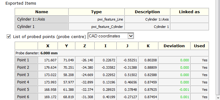 Para ver los puntos sondeados de un elemento medido, active la casilla de Lista de puntos sondeados (centro de la sonda) y seleccione el sistema de coordenadas en el que se expresan las mediciones. Seleccione la opción de: