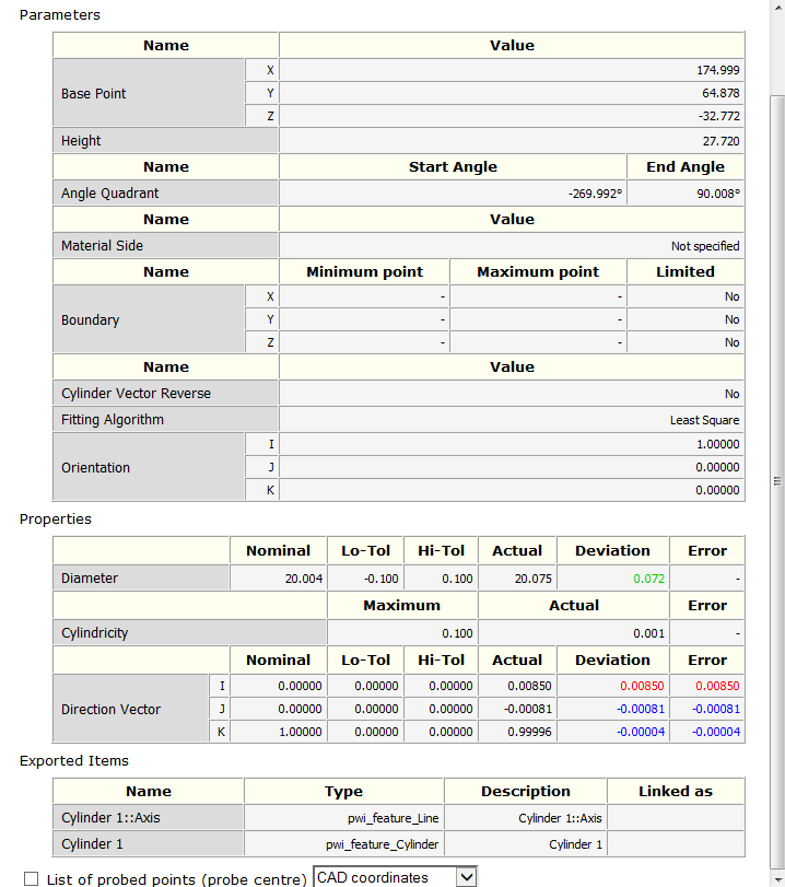 Si se han especificado los nominales para el elemento, se usan colores para indicar si un punto está fuera o dentro de tolerancia. Por ejemplo: