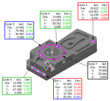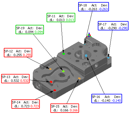 Los colores también se usan para los bordes de las etiquetas de los elementos, y, cuando algunas de las mediciones de un elemento están por encima de la tolerancia y otras están por debajo de la misma, el borde de las etiquetas se muestra de varios colores. Por ejemplo: