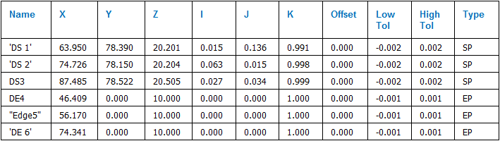 Si únicamente se configuran el nombre, las coordenadas y el vector de cada punto, los valores de offset y tolerancia predeterminados son 0 y el tipo de punto predeterminado es PS.