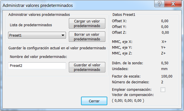 Los valores predefinidos permiten guardar y cargar capturas de los valores DRO. Utilícelos para ahorrar tiempo si se tiene que configurar DRO de manera regular con un mismo conjunto de valores.