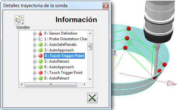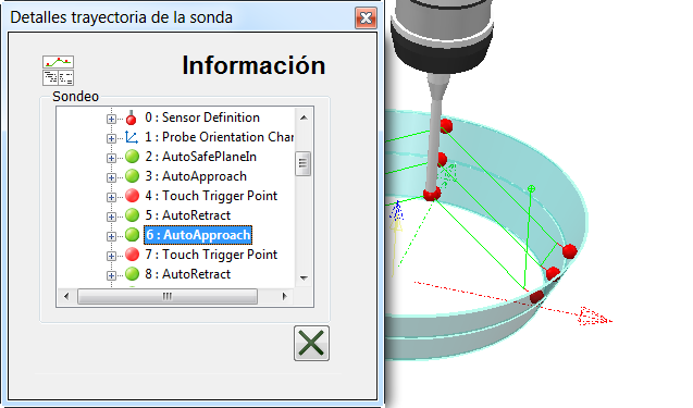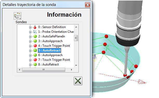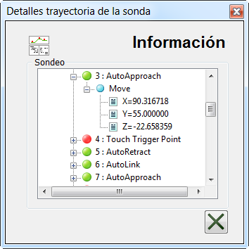 El cuadro de diálogo de Información permite acceder a los detalles de las trayectorias de sonda y recorrer la trayectoria de movimiento en movimiento.