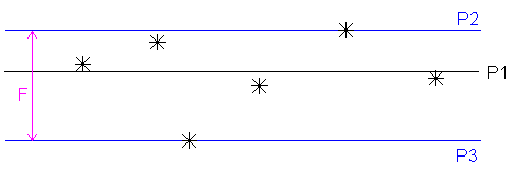 Cuando sondea un plano con más de tres puntos sondeados, PowerInspect crea un plano de ajuste óptimo (P1) que minimiza las desviaciones de todos los puntos. Después ejecuta dos planos paralelos (P2 y P3) a través de los puntos más lejanos en las direcciones positiva y negativa, y la distancia entre P2 y P3 (F) se notifica como la Planitud del plano. Si esta distancia es mayor que el valor Máximo, la planitud está fuera de tolerancia.