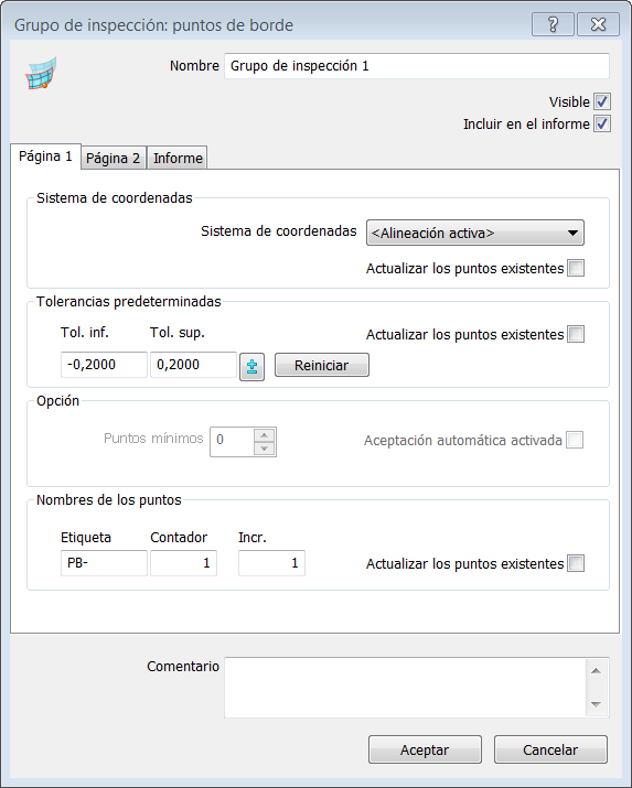 Tolerancias por defecto — Introducir las distancias máximas desde la superficie nominal en la que los puntos están dentro de tolerancia. Seleccionar la casilla de Actualizar puntos existentes para aplicar los valores a los puntos que ya están en el grupo.