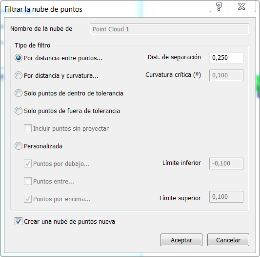 - Para mantener la nube de puntos original y guardar la nube de puntos filtrados como un elemento nuevo, active la casilla de Crear una nube de puntos nueva.