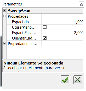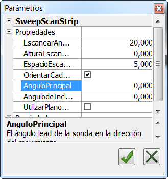 SweepScanStrip: genera una curva sinusoidal junto con los escaneados de sonda; los puntos definen la espina de la curva. Se tienen que configurar los valores de SurfaceScanWidth, SurfaceScanHeight, SurfaceScanPitch, LeadAngle y LeanAngle para el escaneado en el cuadro de diálogo de Parámetros. Por ejemplo: