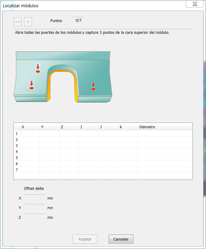 A medida que sondea los puntos, el cuadro de diálogo va reflejando las coordenadas de máquina XYZ, los vectores IJK, el Diámetro de la sonda y el número de puntos que faltan.