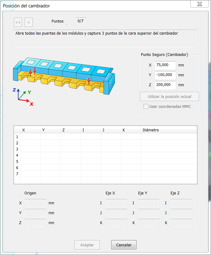 A medida que sondea los puntos, el cuadro de diálogo va reflejando las coordenadas de máquina XYZ, los vectores IJK, el Diámetro de la sonda y el número de puntos que faltan. Cuando se han capturado los siete puntos, el cuadro de diálogo indica Posicionamiento completado para confirmar que el cambiador se ha localizado en el dispositivo de medición. También refleja el Origen del sistema de coordenadas del cambiador expresado en coordenadas de máquina, la orientación del cambiador en vectores IJK y la posición del Punto seguro.