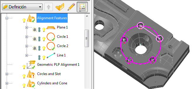 - Etiquetas y dimensiones gráficas: colores que indican las mediciones de dentro y fuera de tolerancia en las etiquetas y las dimensiones, así como en las pestañas de Info e Informe.