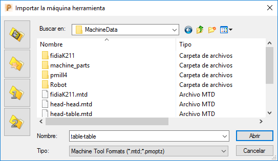 Al hacer clic en la pestaña de Máquina herramienta > panel de Fichero > Importar se muestran los ficheros MTD existentes: