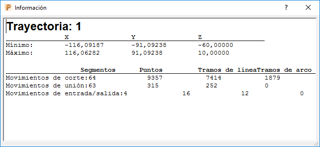 Haga clic en la pestaña de Trayectoria > panel de Información > Propiedades para mostrar el nombre, las extensiones y la información sobre los movimientos de corte para la trayectoria activa.