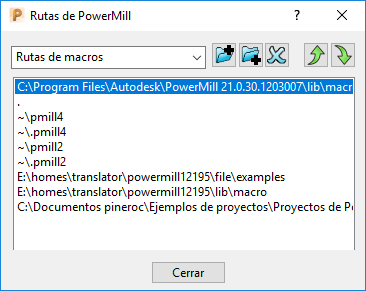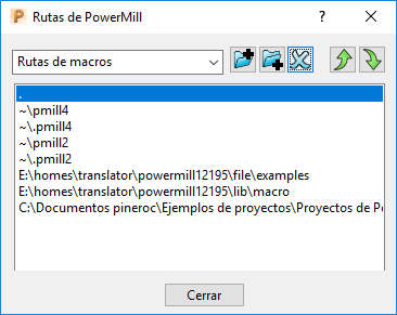 Seleccione la ruta de macros que desea eliminar (en este caso E:/Pmill/Reference2012/Macros) y luego seleccione el botón Suprimir.