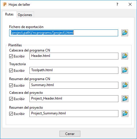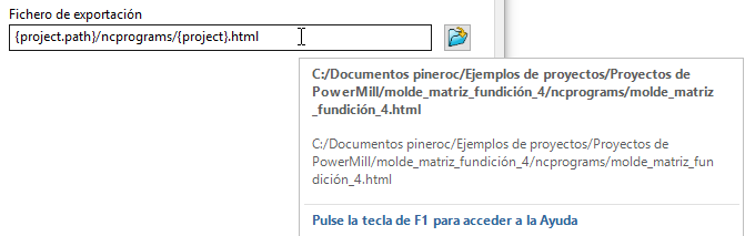 Fichero de exportación — Especifique la localización y el nombre del fichero raíz para las hojas de taller. Por defecto, PowerMill utiliza la carpeta que contiene el proyecto actual (indicada por la variable {project.path}) y crea el fichero /ncprograms/{project}.html dentro de ella.
