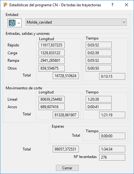 Es posible mostrar los valores de longitud y tiempo de todos los movimientos de entradas, salidas, uniones y de corte, además del número de listas en el programa CN seleccionado.
