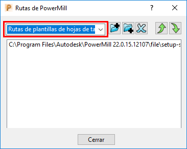 - En la lista del cuadro de diálogo de Rutas de PowerMill seleccione Rutas de plantillas de hojas de taller. Se muestra la ruta de la plantilla seleccionada actualmente.