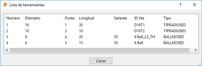 Es posible mostrar todas las herramientas utilizadas en un programa CN, y los parámetros utilizados para crear las herramientas.